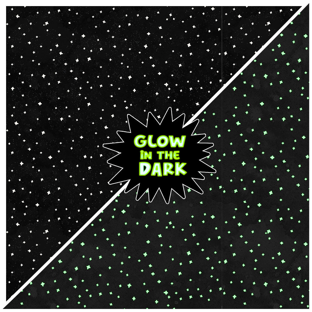 This print features white glow in the dark stars on a black background.