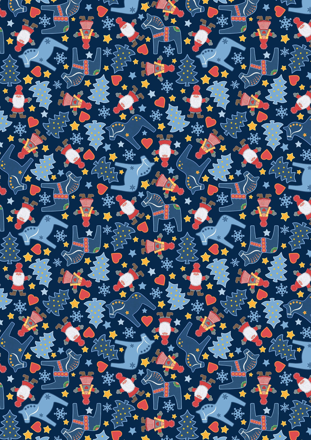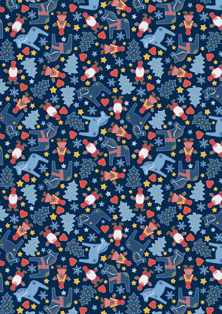 Tomtens in cozy red hats, decorative Dala horses, pine trees, hearts, stars, and snowflakes are scattered across a deep navy background in this wintry Scandinavian print. The cool palette of blues, soft reds, and golden yellow evokes a quiet forest night under the stars. The whimsical folk-art style gives this fabric a festive yet timeless charm, perfect for winter and holiday sewing.