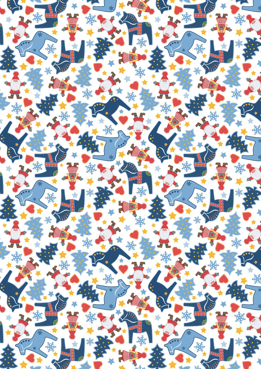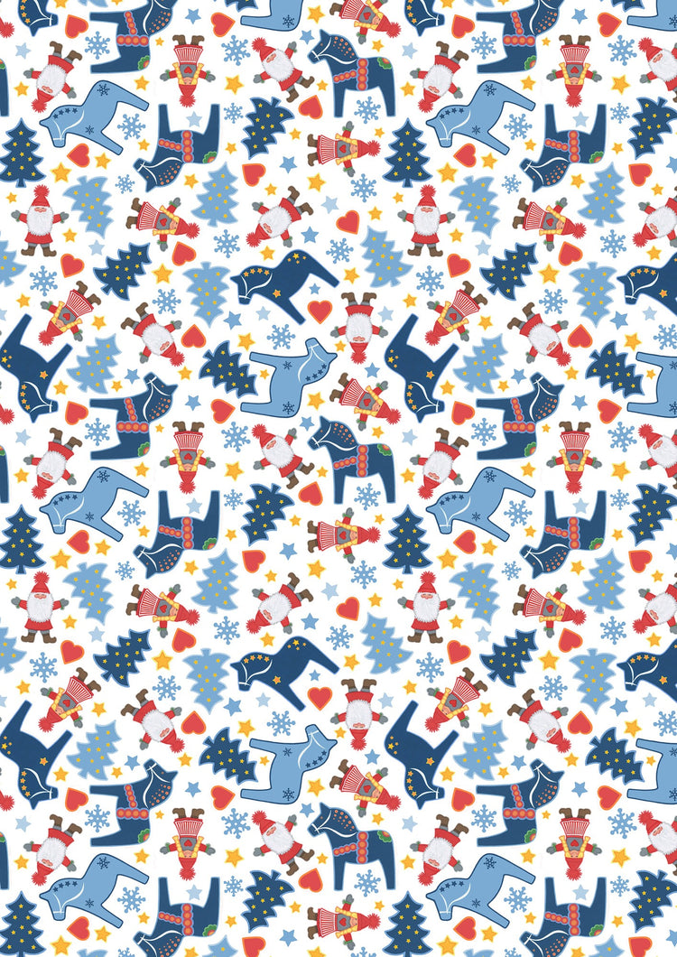 This lively winter scatter print features Tomtens in cozy red knit hats with pom-poms, decorative Dala horses, stylized pine trees, snowflakes, golden stars, and folk-art hearts — all set against a snowy white background. The palette of soft blues, navy, red, and yellow brings a crisp, cheerful feel to this Scandinavian-inspired design.