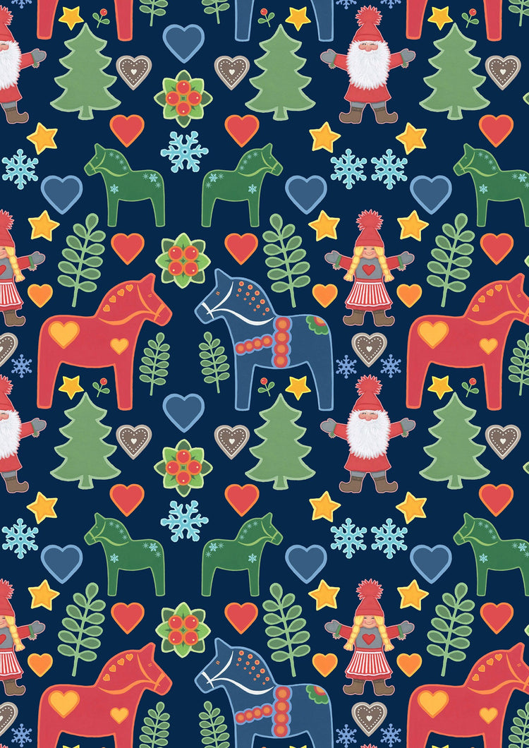 A beautifully structured design featuring painted horses, trees, Tomtens, hearts, and Nordic florals in a repeat layout. Set on a dark navy background, this print evokes the look of traditional holiday paper or Scandinavian gift wrap.