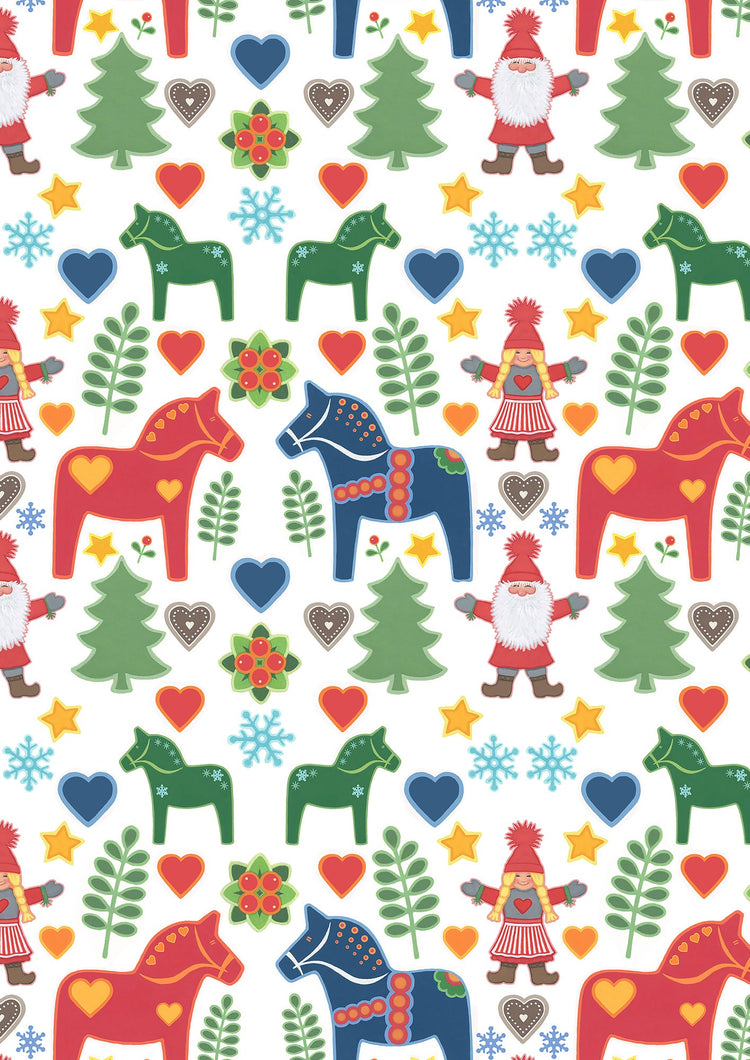 This crisp white fabric showcases a charming Nordic arrangement of Dala horses, Tomtens in festive red hats, pine trees, hearts, stars, and berries. The layout is structured yet playful, giving it a classic folk-art feel with vibrant pops of color. Perfect for winter and holiday projects that call for a bright, decorative focal print.