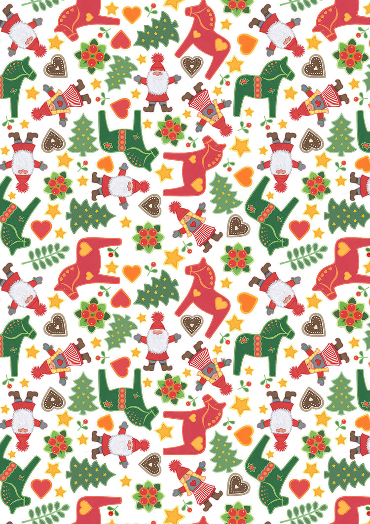 This festive allover print features Tomtens, painted Dala horses, trees, stars, and berry sprigs scattered across a snowy white background. With its playful scale and cheerful Nordic colors, this design captures the magic of Scandinavian folklore and brings warmth to holiday makes.