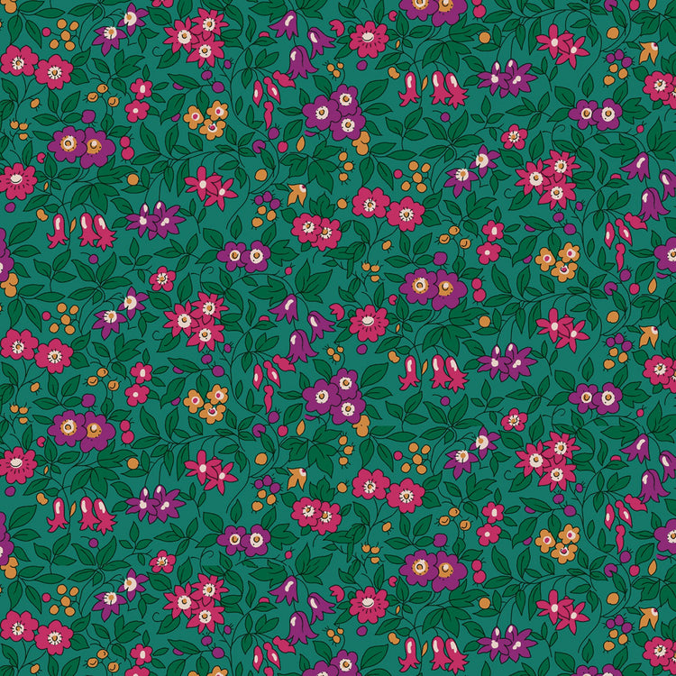 This print features berries, daisies, bell flower and forget-me-nots drawn with a very crisp and fine outline, paying homage to the traditional Liberty style and layout. Machine Wash Cold / Line Dry.