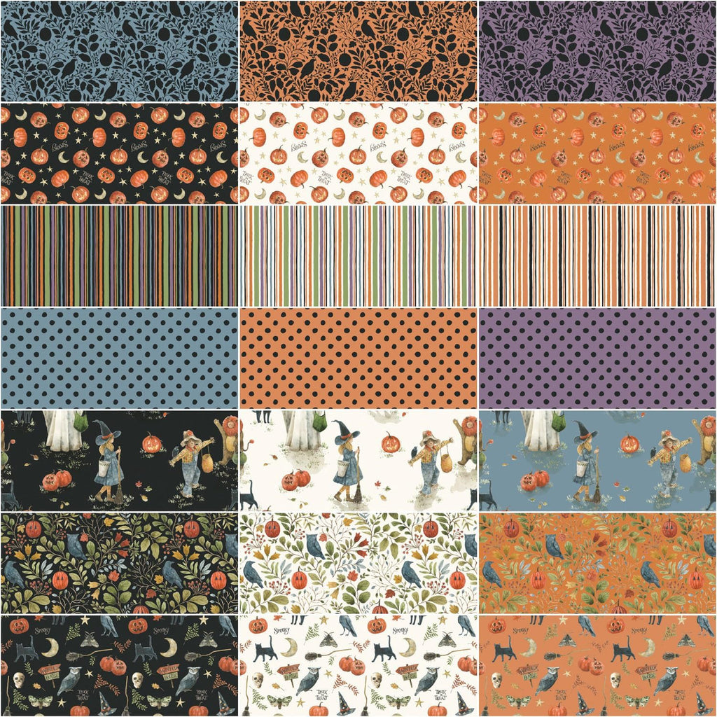 This 21-piece fat quarter bundle from the Trick or Treat collection by Lisa Audit features a charming mix of Halloween and autumn-inspired prints. Each 18" x 22" cut highlights Lisa’s signature watercolor style with playful ghosts, pumpkins, black cats, witches, and fall foliage in a rich palette of dusk, black, orange, cream, and plum. Perfect for seasonal quilts, décor, or handmade gifts, this bundle brings together spooky fun and artistic elegance in one versatile set.