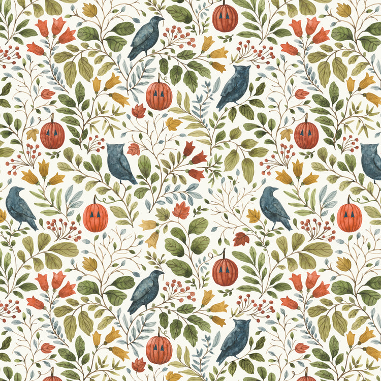 This enchanting fabric features a delightful autumnal design with a cream background adorned with vibrant foliage, pumpkins, and birds. The pattern captures the essence of fall with its mix of red, orange, and green leaves, interspersed with charming birds and whimsical pumpkins, creating a festive and warm atmosphere perfect for seasonal projects.