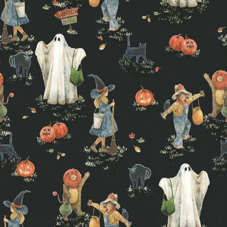 This charming fabric features a whimsical Halloween scene set against a deep black background. The design showcases children dressed in various costumes, including ghosts, witches, and scarecrows, engaging in trick-or-treating activities. Scattered pumpkins, black cats, and a sign pointing to a "Haunted House" add to the festive atmosphere, creating a playful and nostalgic feel perfect for crafting Halloween-themed projects or adding a touch of seasonal fun to any decor.