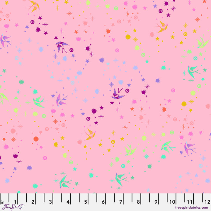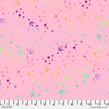 Get ready to add some playful color to your next project with this cheerful blender by Tula Pink. This wonderfully versatile fabric features small scattered dots, stars, and birds on a neon yellow background.