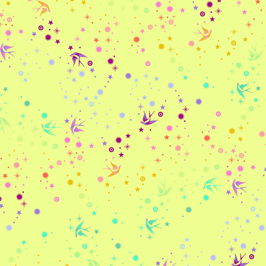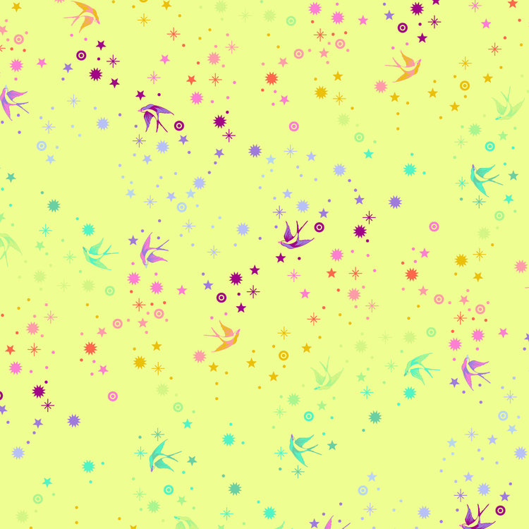 Get ready to add some playful color to your next project with this cheerful blender by Tula Pink. This wonderfully versatile fabric features small scattered dots, stars, and birds on a neon yellow background.