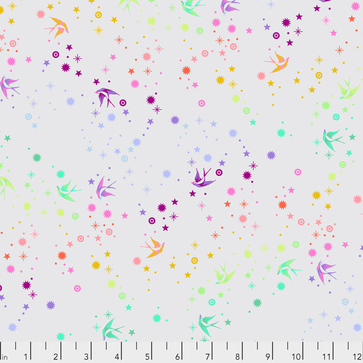 Get ready to add some playful color to your next project with this cheerful blender by Tula Pink. This wonderfully versatile fabric features small scattered dots, stars, and birds on a light gray background.