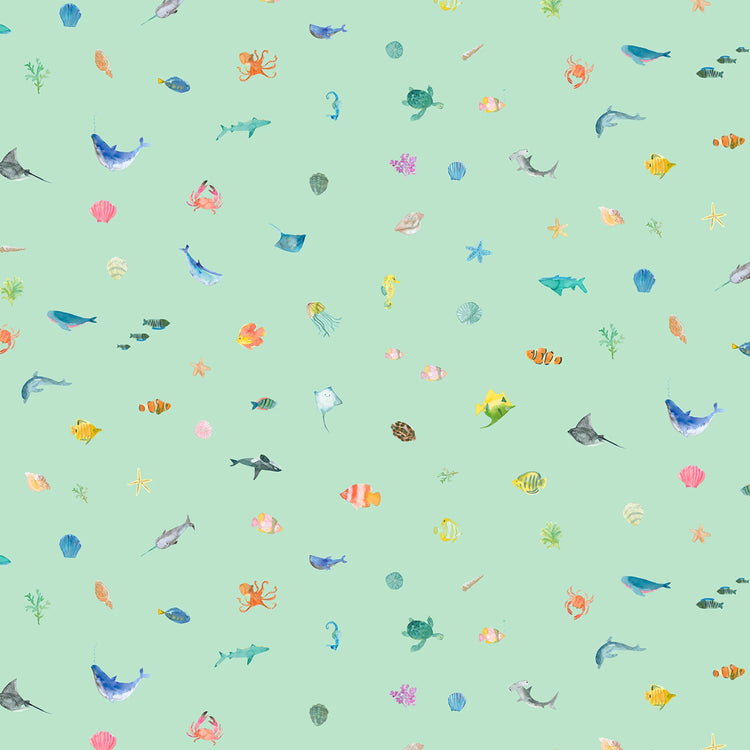 This delightful cotton fabric features a whimsical sea-themed design, showcasing a variety of colorful marine life against a soft seafoam green background. The pattern includes playful illustrations of fish, octopuses, starfish, seashells, and other ocean creatures, creating an underwater adventure that brings the charm of the sea to any project. Ideal for crafting, quilting, or apparel, this fabric's vibrant and cheerful design is sure to captivate both adults and children alike.