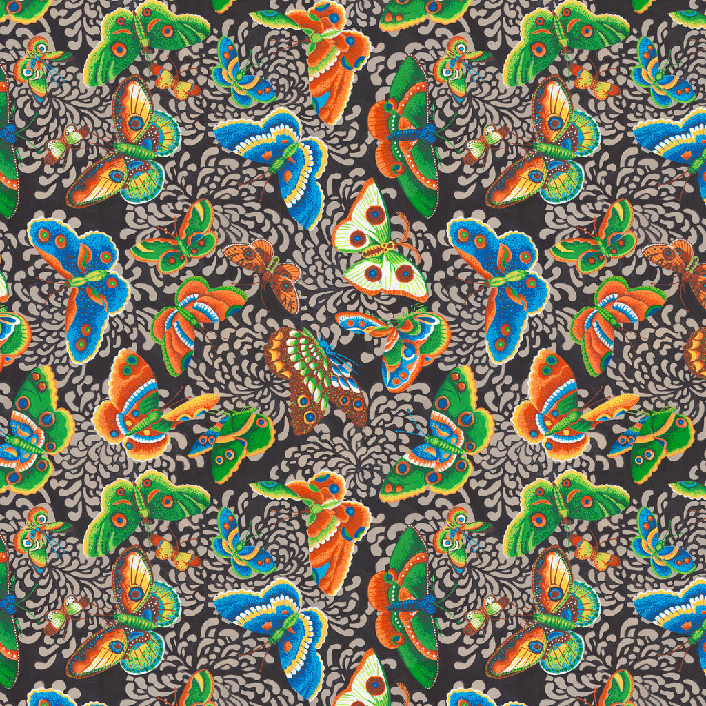 Lush butterflies in brilliant blues, greens, and oranges flutter through stylized gray florals on a dramatic black ground. This print makes a striking statement in eclectic quilts or as a feature fabric in wall hangings and accessories.