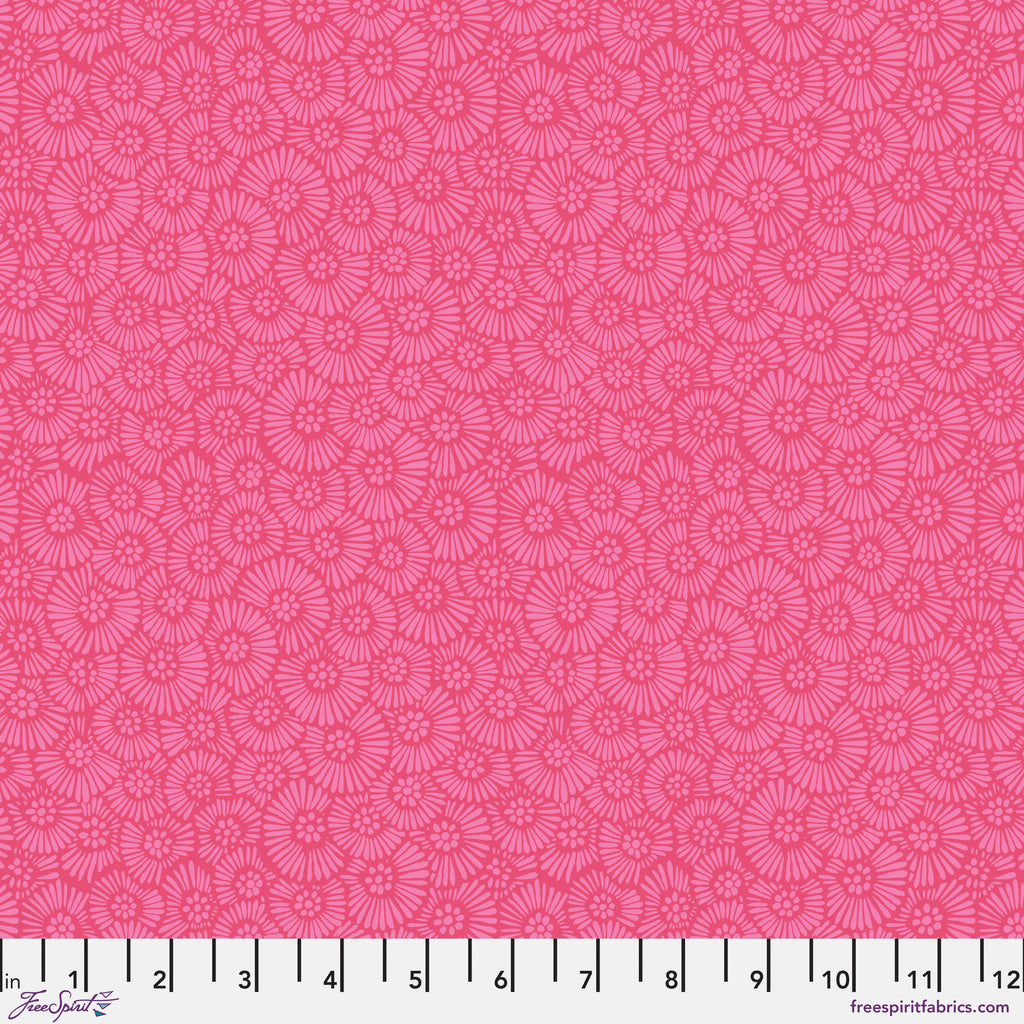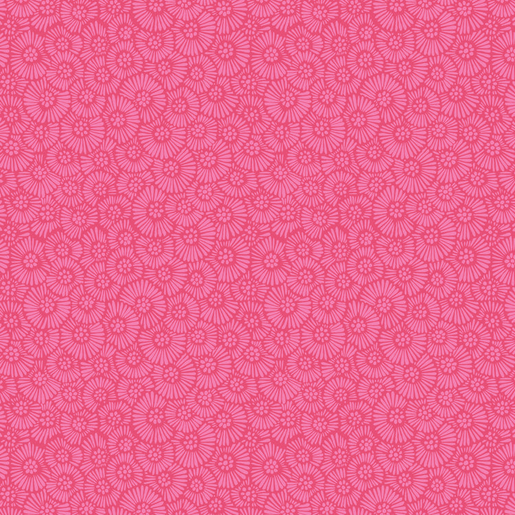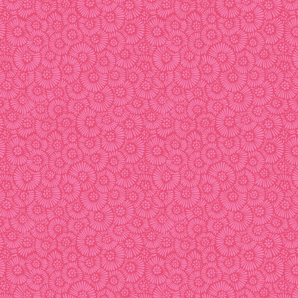 This pink-on-pink daisy print adds cheerful texture with its dense pattern of stylized blooms. Ideal as a tonal blender with personality, it brings warmth and whimsy to floral and juvenile projects.
