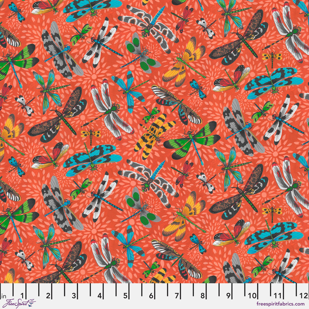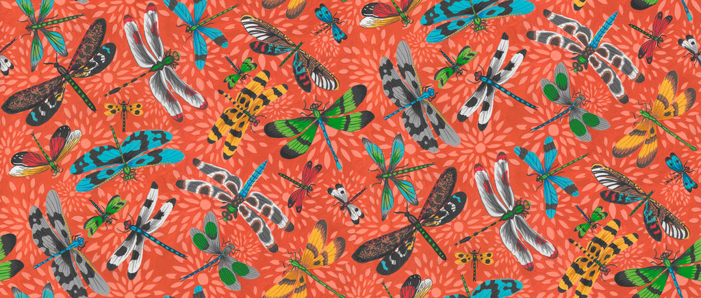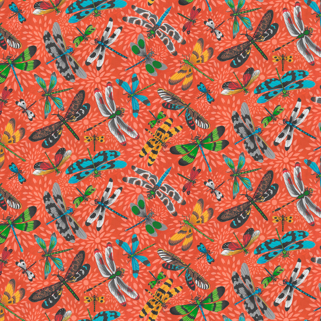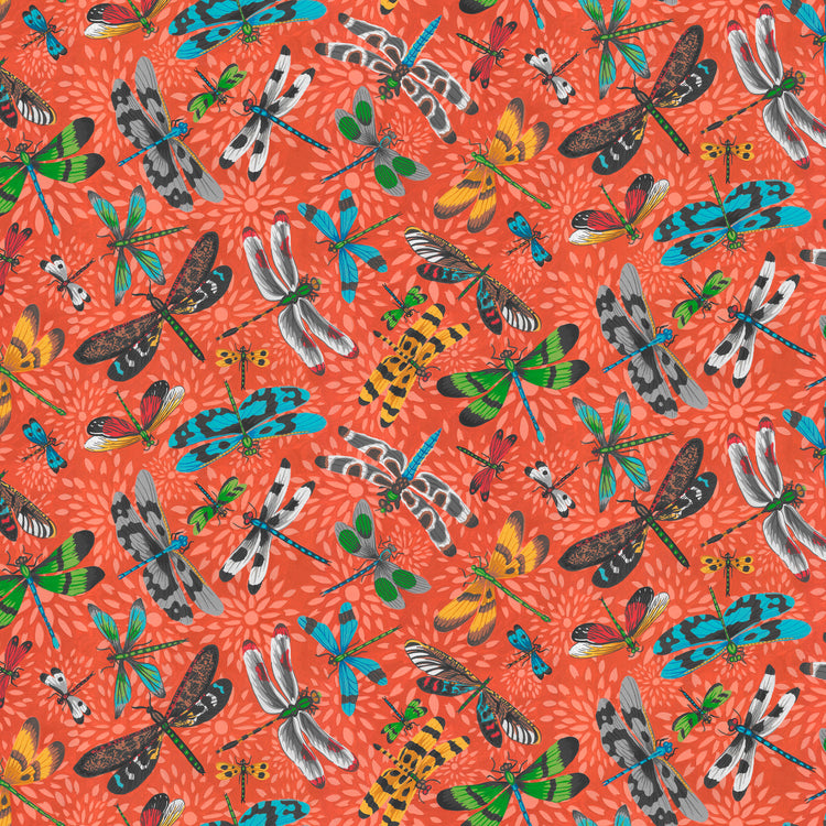 An array of dragonflies in jewel-like tones dances across a bold tangerine background. With its lively movement and rich color, this print brings a magical spark to quilts, bags, and summery home décor.