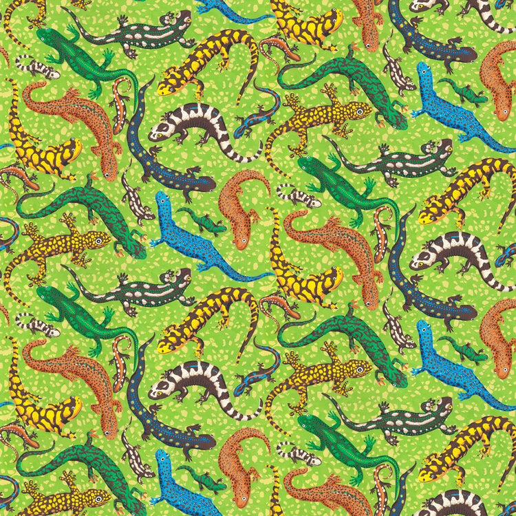 Brightly patterned lizards and geckos twist and turn across a lively green speckled ground. This quirky and dynamic print adds a tropical pop to animal-themed quilts, nature projects, or bold borders.