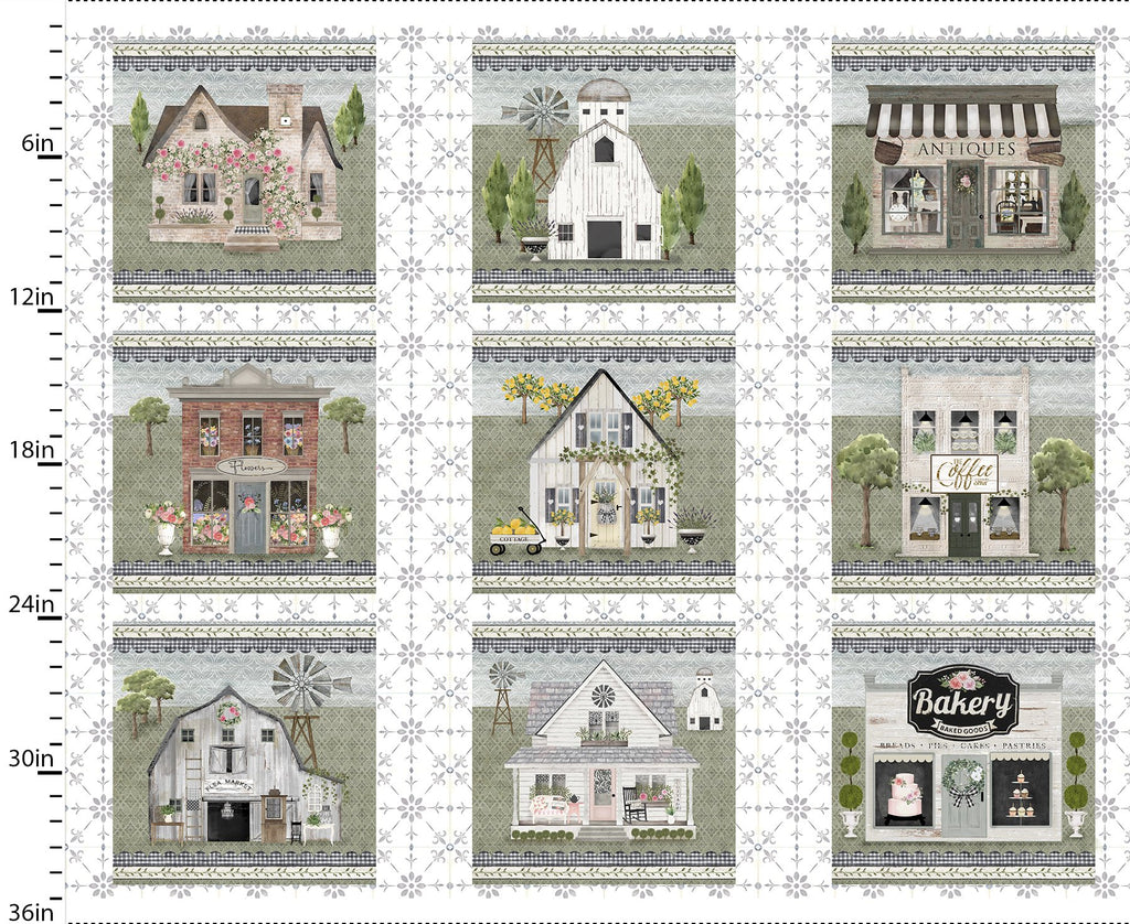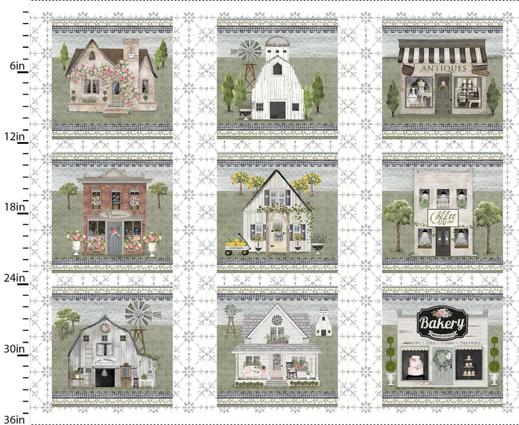 This fabric panel by Beth Albert for 3 Wishes Fabric is a delightful 36" x 42" panel that captures the charm of small-town life. Featuring nine 10" blocks, each illustrates quaint storefronts, cozy cottages, and rustic barns, all adorned with floral accents and vintage details. Rendered in a soft palette of sage greens, blush pinks, and warm neutrals, this 100% cotton panel is perfect for creating wall hangings, quilt centers, or fussy-cut projects that evoke a serene countryside ambiance.