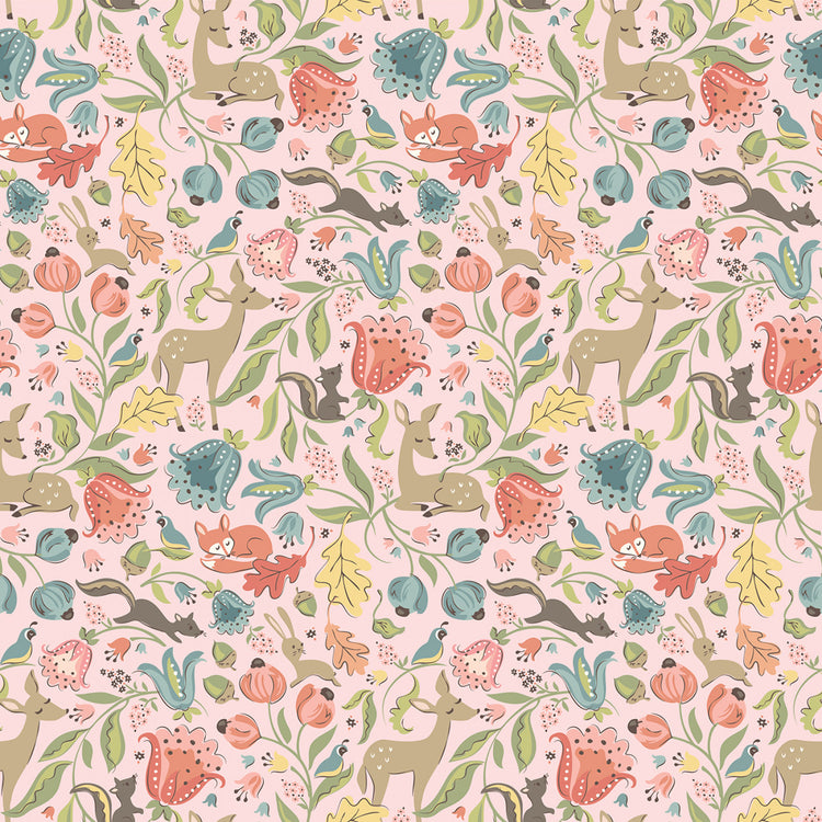This charming fabric features a delightful meadow scene with an array of playful deer, foxes, and squirrels frolicking among vibrant flowers and leaves. Set against a soft blush pink background, the design combines a whimsical touch with a natural aesthetic, making it perfect for creating enchanting children's clothing, home decor, or unique craft projects. The intricate pattern ensures that each piece cut from this fabric will bring a touch of the forest's magic into any project.