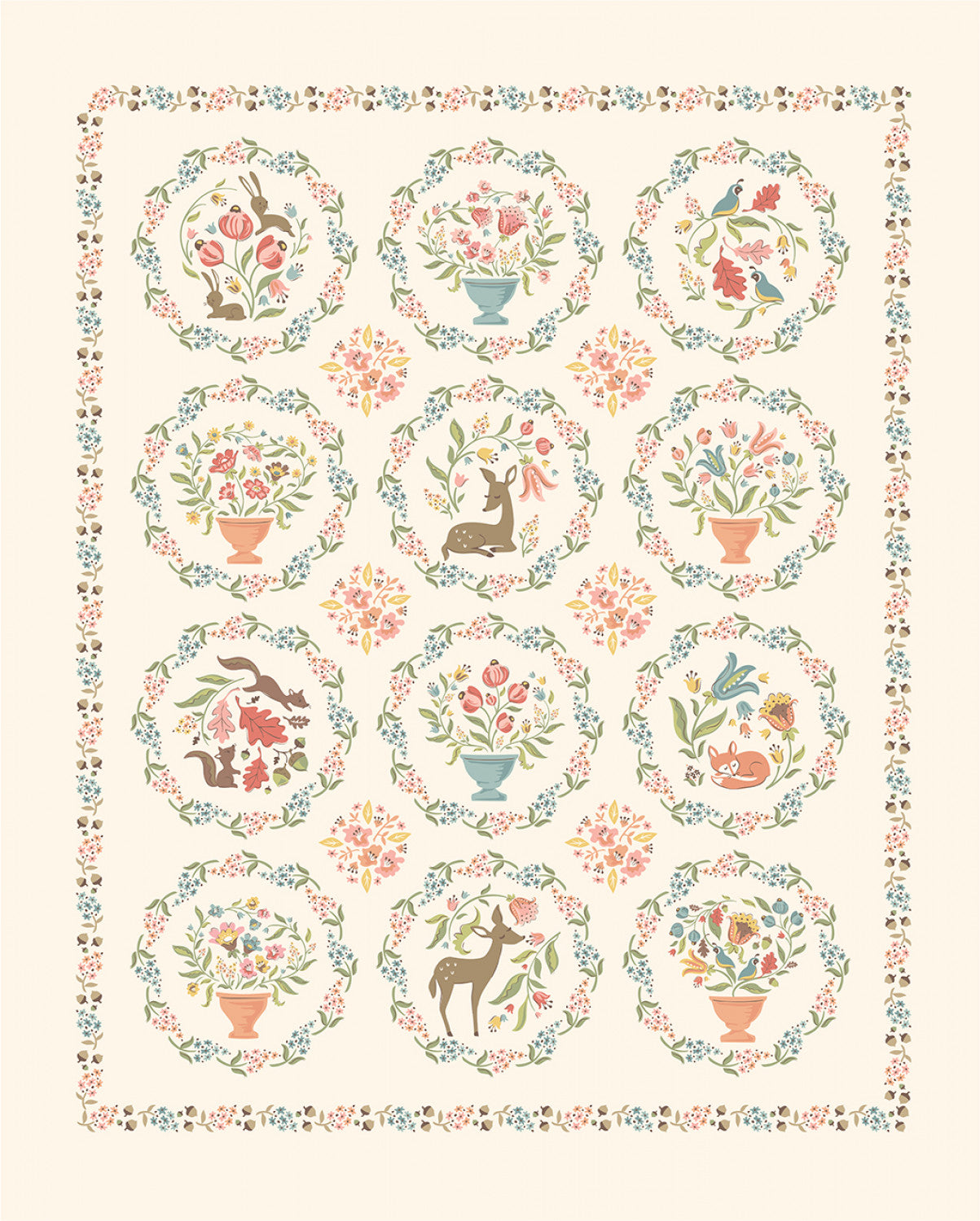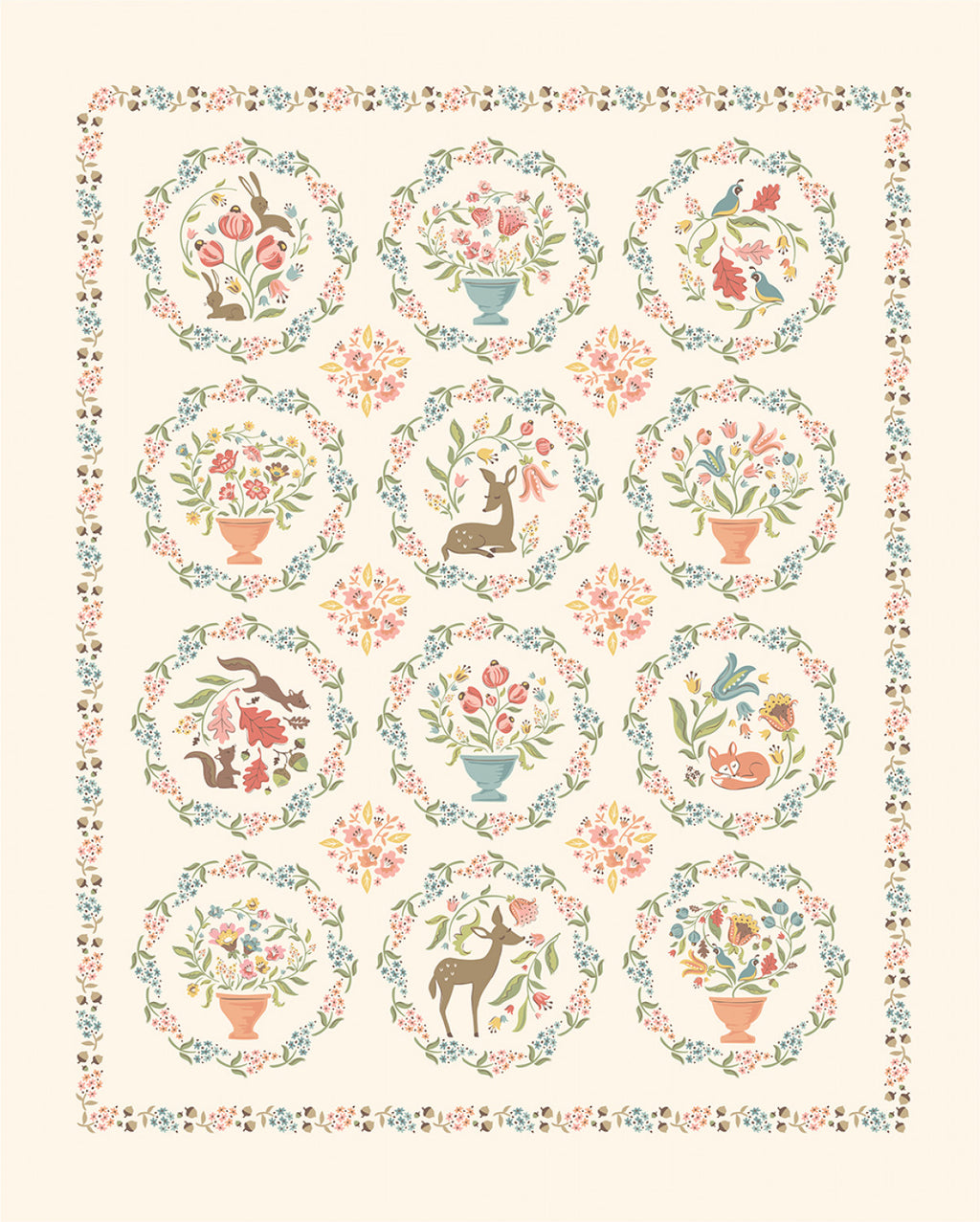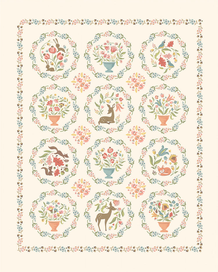 This charming fabric features a delightful cream background adorned with a series of circular panels, each intricately designed with floral arrangements and woodland creatures. The panels are framed by delicate, colorful floral borders, creating a harmonious and whimsical pattern that evokes a sense of vintage elegance. The design includes various elements such as deer, rabbits, and birds, each nestled among vibrant flowers, making it perfect for quilting, crafting, or home decor projects that seek a touch of nature-inspired beauty.