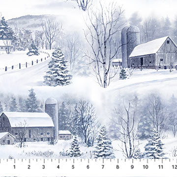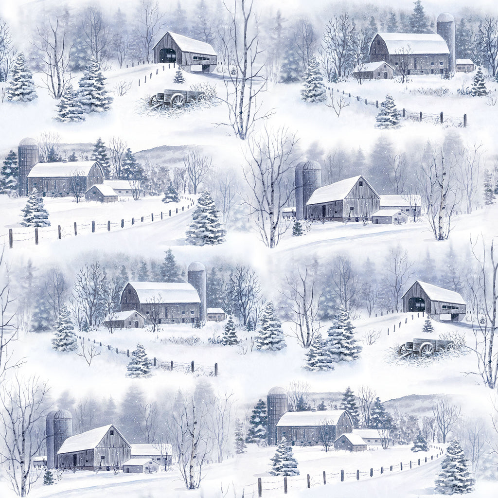 "Winter Jays", a collection by Art Brand Holdings, depicts a serene winter landscape with blue jays and chickadees in a tranquil country setting. The fabrics feature images of birds, barns, and pinecones, as well as wood grain and snowy textures in various shades of blue, from light to dark. "Winter Jays" is printed on premium quality flannel.