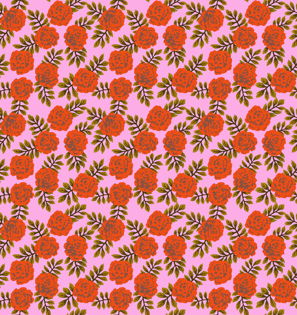 This 100% cotton print features bright, expressive carnations in saturated orange-red with leafy olive accents on a lively pink ground. The repeat is bold but nicely balanced, adding movement and color without overwhelming your patchwork. It’s perfect for feature blocks, borders, bags, and any project that needs a floral with strong personality. It pairs easily with the smaller mixers in the Yesterday collection and works beautifully in both modern layouts and nostalgic, vintage-inspired quilts.