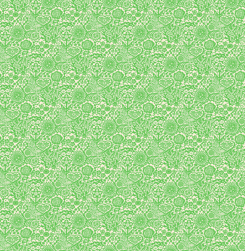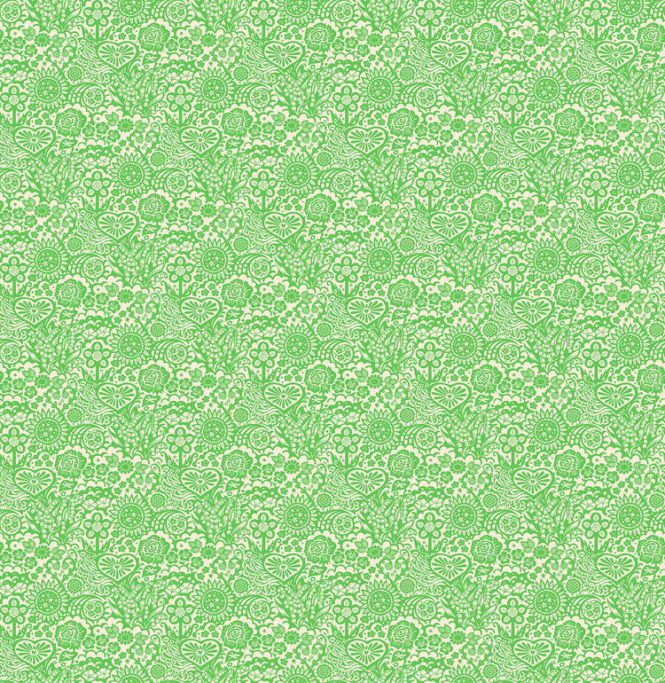 This 100% cotton print features an intricate garden of flowers, hearts, and leafy motifs in a crisp spring green on a soft cream ground. The small-scale, allover layout makes it an excellent blender with plenty of visual interest—adding texture and movement while still reading clean and light in a quilt. It’s perfect for sashings, bindings, scrappy layouts, and modern patchwork that needs a bright, cheerful green without feeling solid. The heart details add a sweet touch, but the overall look remains versatile rather than seasonal.