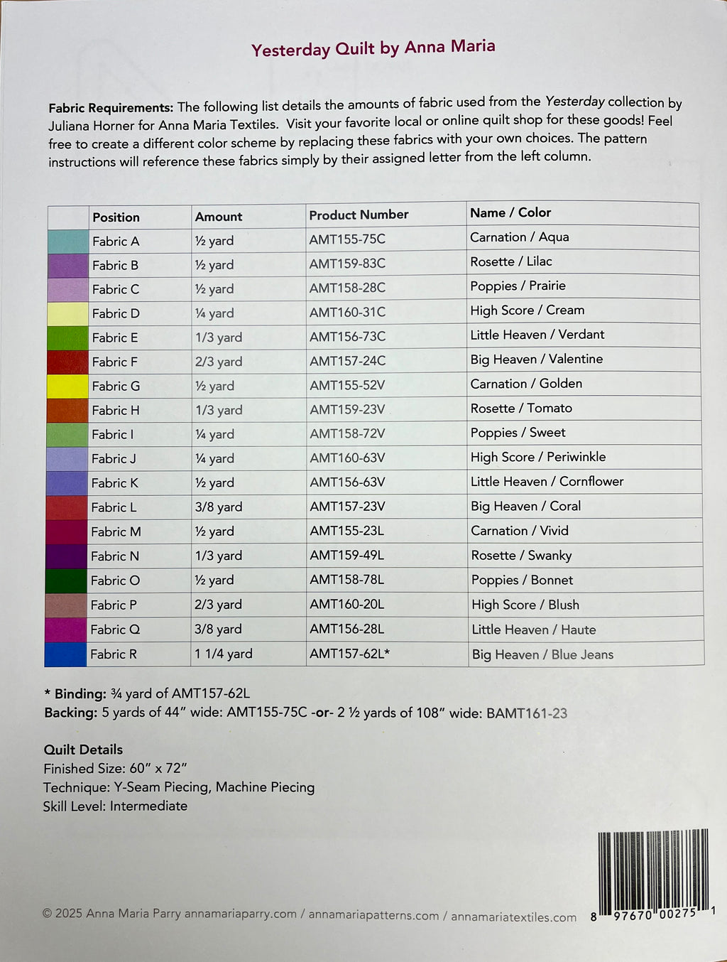 The Yesterday quilt pattern by Anna Maria Patterns includes full instructions plus three custom acrylic templates used to create the star blocks. The quilt finishes at 60” x 72” and features a striking layout that highlights bold prints and color combinations. Construction uses both machine piecing and Y-seam techniques, making it a great project for intermediate quilters. The included templates ensure accurate cutting and crisp shapes, helping the blocks come together with precision. A beautiful pattern for showcasing the Yesterday collection or any favorite range of expressive fabrics.